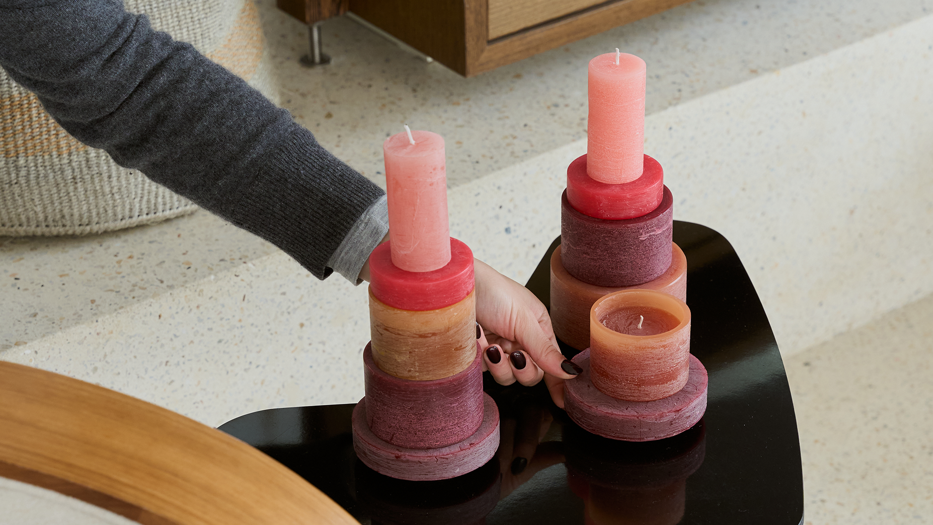 Earthy color stackable candle from Stan Editions with white background. Stapelbare kaars van Stan Editions in aardse kleuren met witte achtergrond. Bougie empilable de Stan Editions aux couleurs terreuses sur fond blanc.